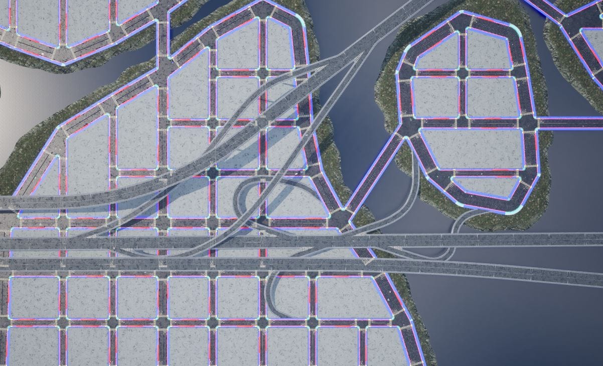 The overpass roads and elements have undergone a materiality update to match the realism level of the city street roads. This update involved UV mapping and remapping the overpass roads and street reflectors to include edge wear and blemishes, enhancing their visual authenticity.