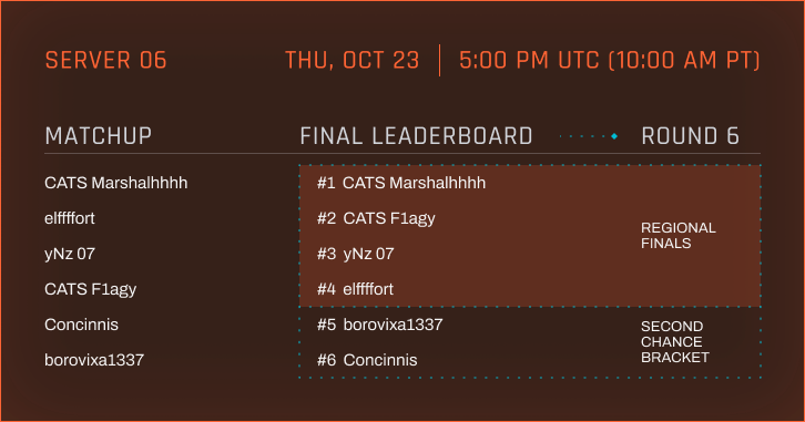 Main Bracket: The remaining 6 top competitors face off in a single gated server as the Main Bracket reaches its final stage. Every placement counts. This round decides who goes straight to the Regional Finals and who drops into the Second Chance Bracket for one last opportunity to qualify.