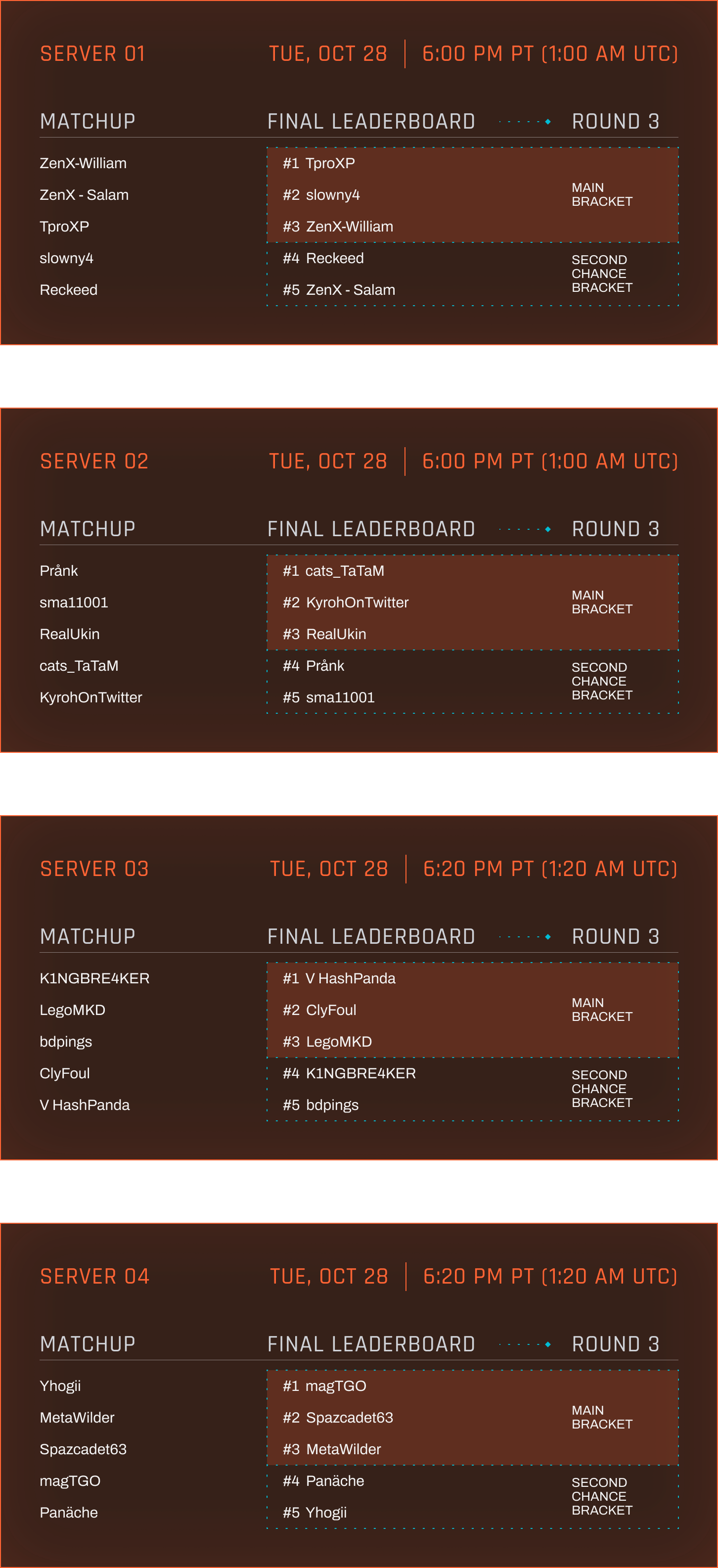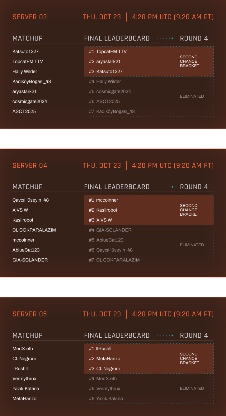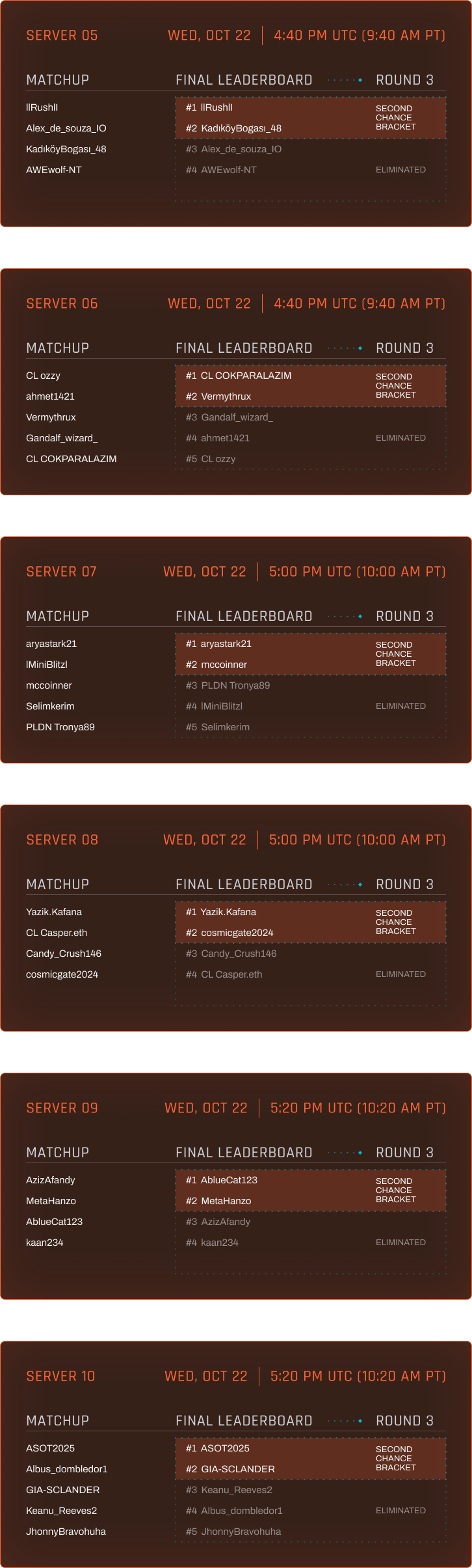 Second Chance Bracket: Players from the previous Second Chance Round, along with those who dropped from the Main Bracket, compete across 3 new servers to stay in contention. With the field narrowing, pressure is at its peak — only the top performers remain.