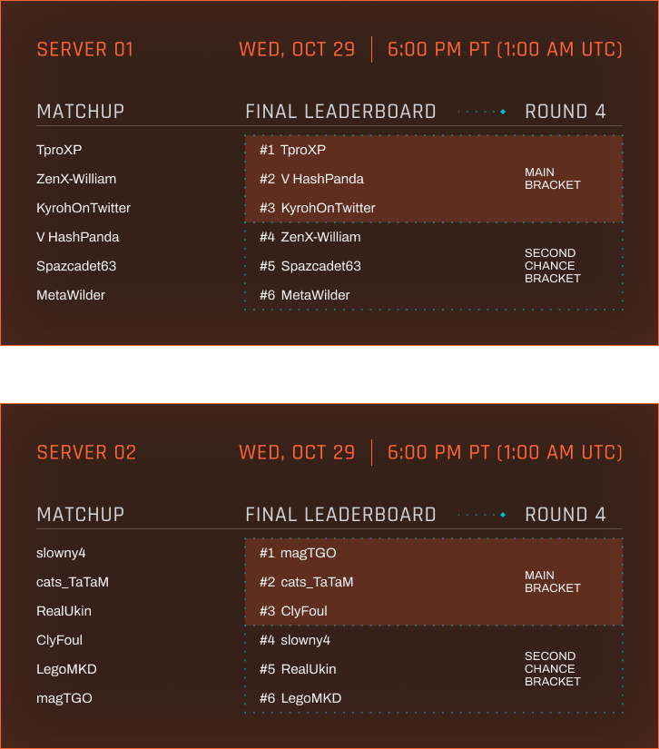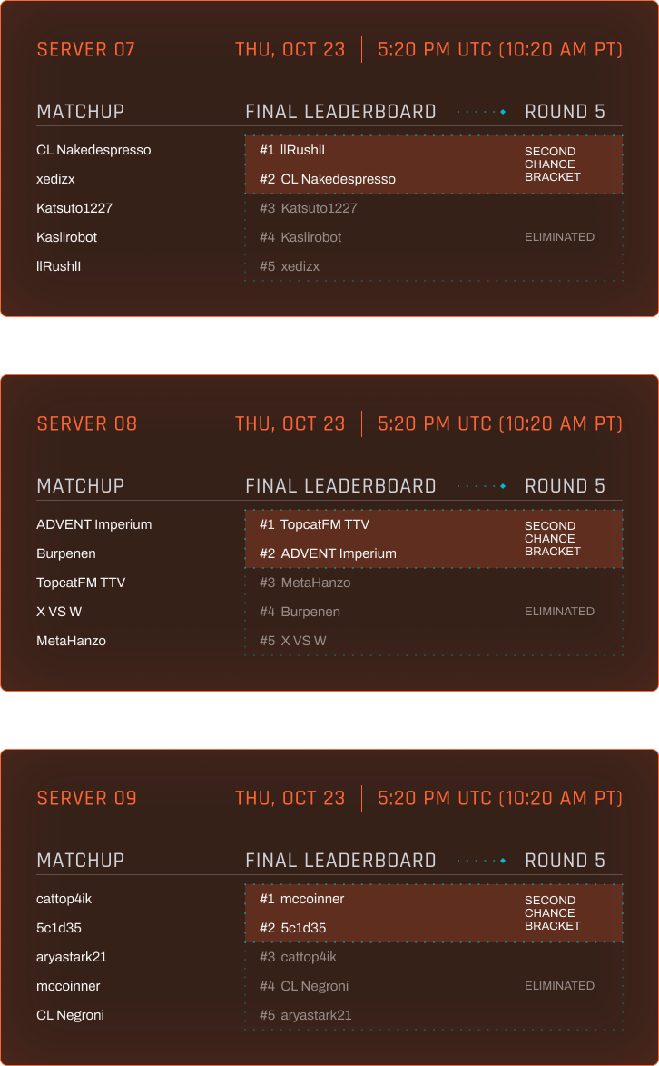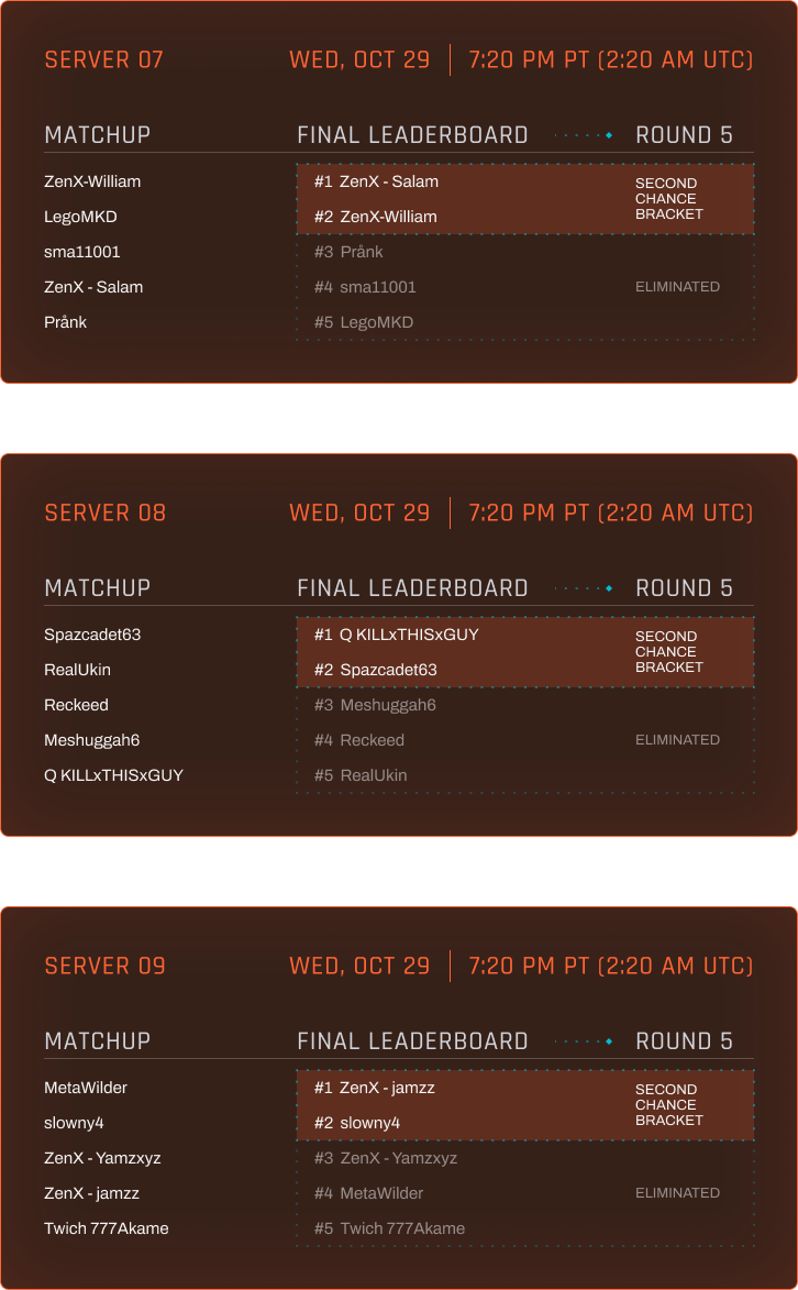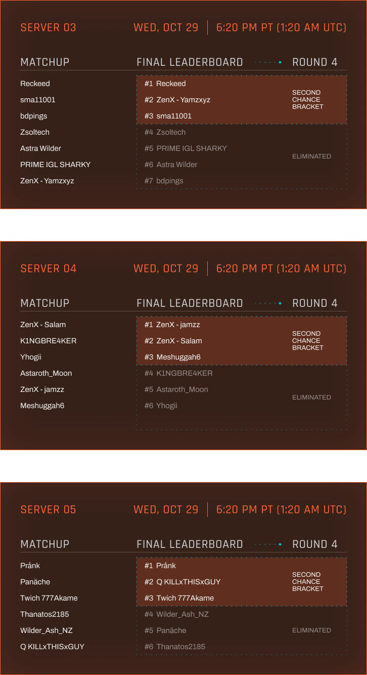 - Top 2 from each server advance to Second Chance Bracket, Round 5.