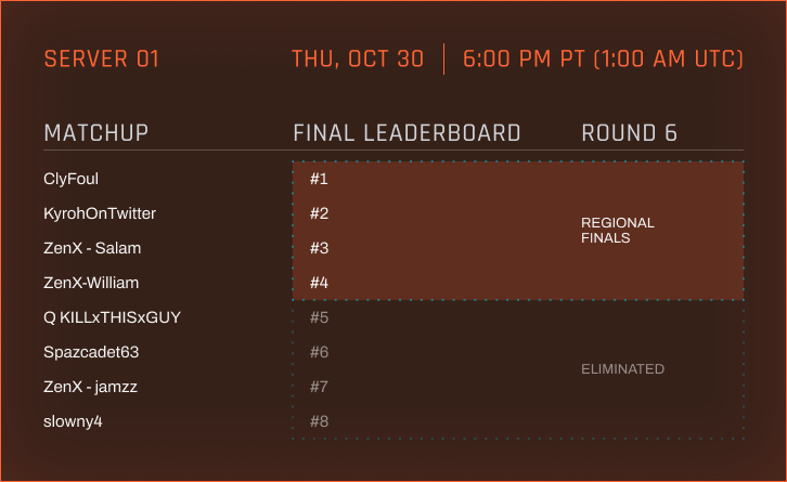 - Top 4 from this server advance to the Regional Finals (Round 6).