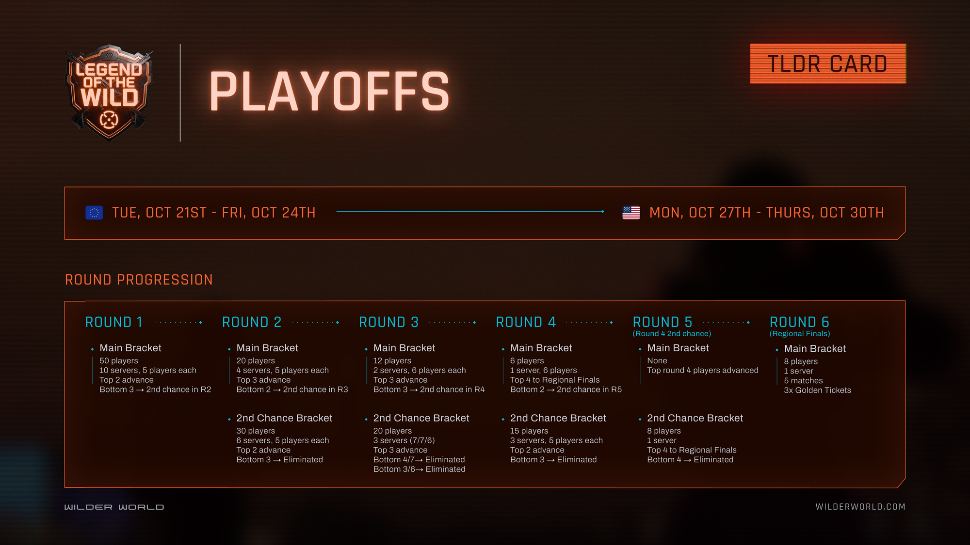 The US Playoffs will follow the week after, running from Monday, October 27th at 6 PM PT / 1 AM UTC through Thursday, October 30th.