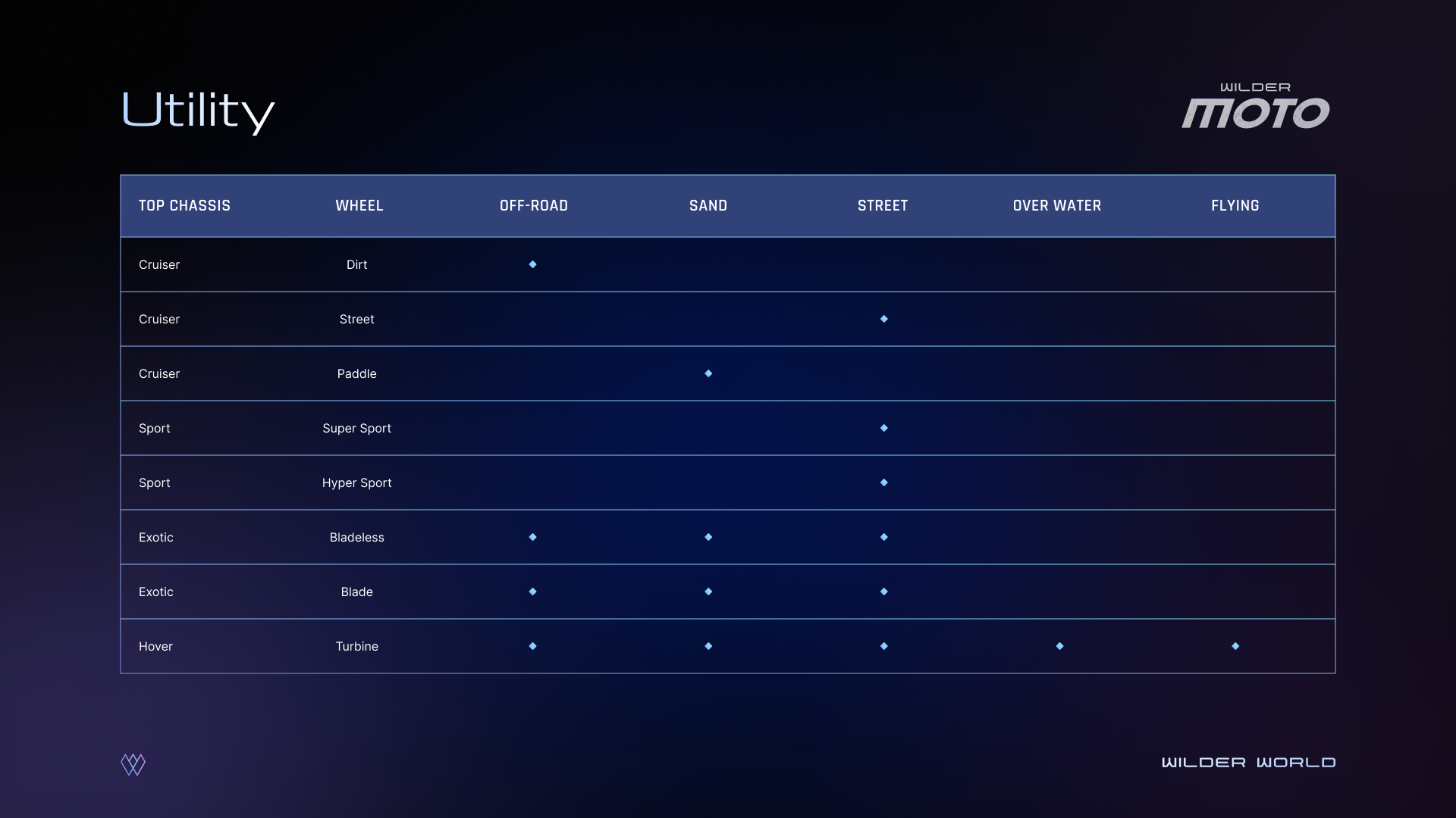 Like the Wilder Wheels collection, Moto features dynamic in-world utility giving Wilders the edge they need to have a transcendent experience in Wiami. A breakdown of this utility is outlined in the table below: