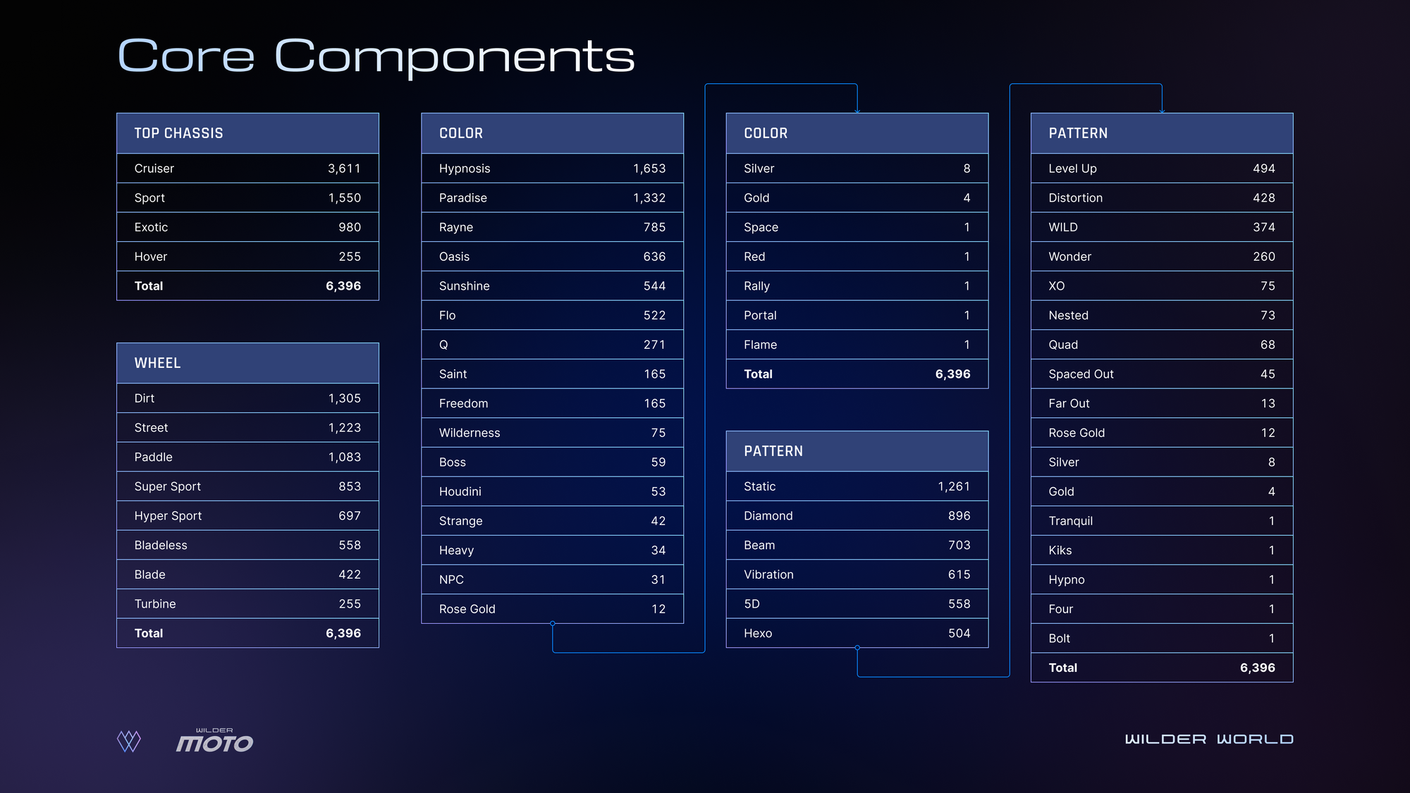 Moto rarity is the culmination of all the learning we’ve accumulated from previous Wilder collections. The end result is a collection primed for easy third party rarity service integration and no weights used in the rarity calculation.